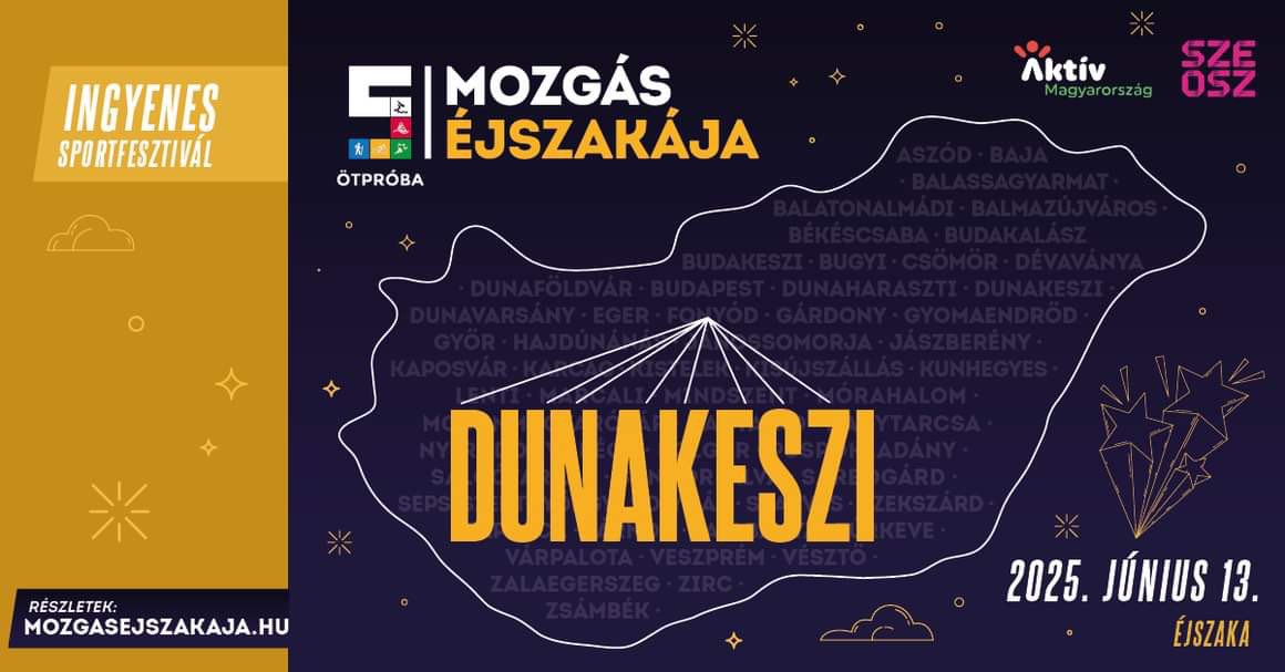 2025. júniusában újra mozgásba lendül az ország! A Mozgás Éjszakája idén is elhozza a sport és az aktív kikapcsolódás ünnepét Budapestre és Magyarország számos pontjára – köztük Dunakeszire is. Az esemény célja, hogy mindenkit megmozgasson, kortól és edzettségi szinttől függetlenül – mindezt ingyenes programokkal, éjszakába nyúló közösségi élményekkel.
